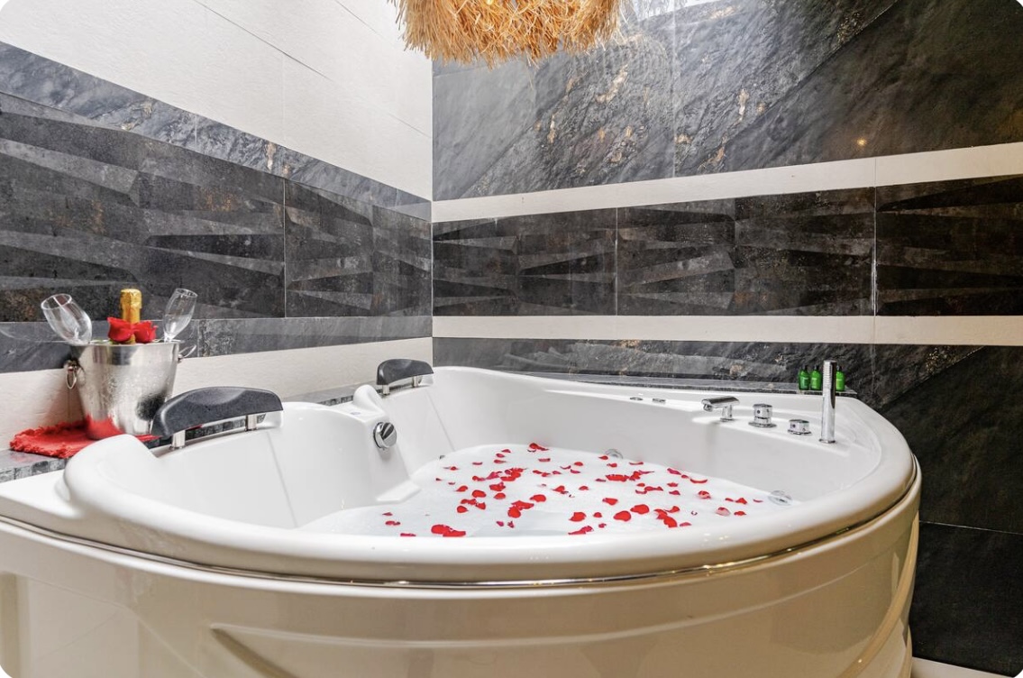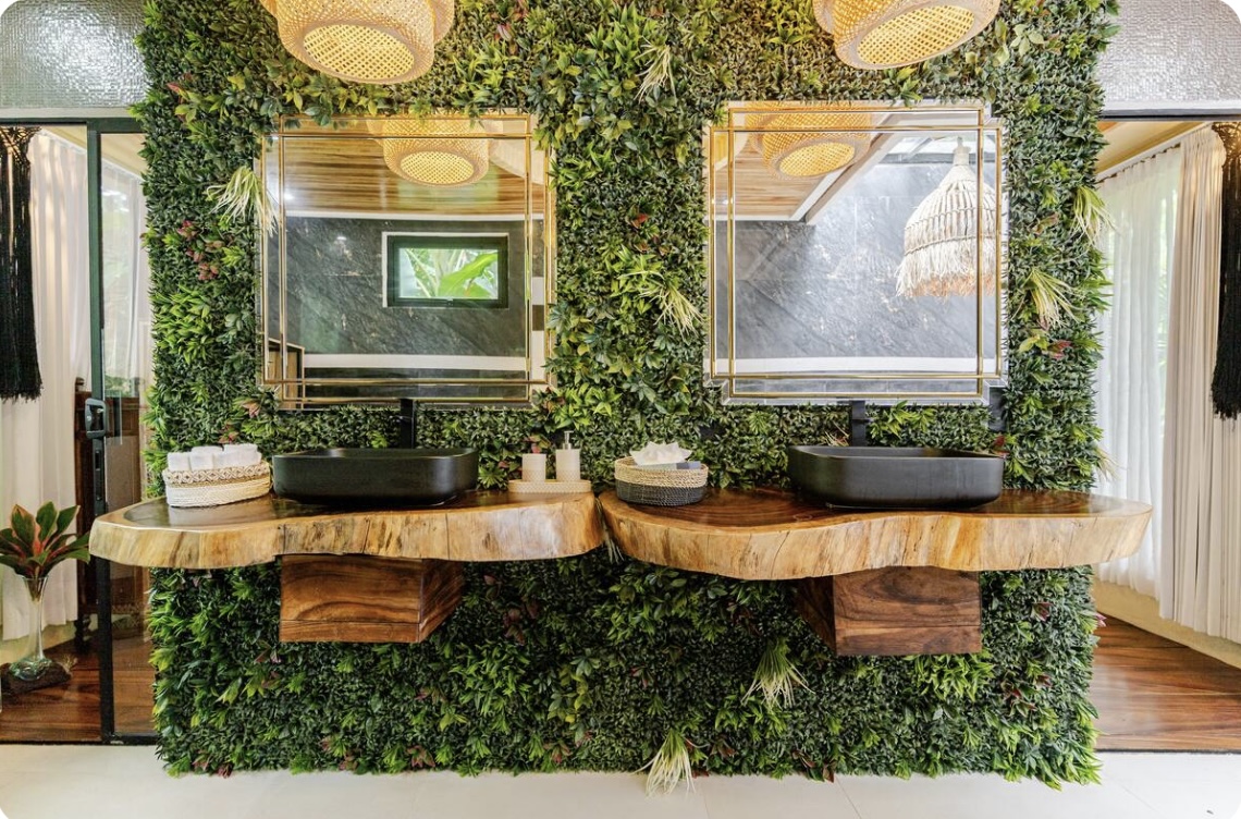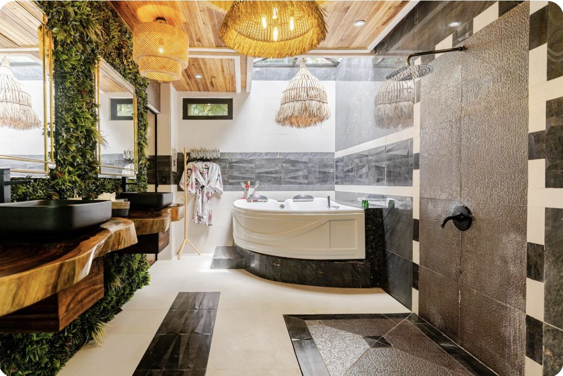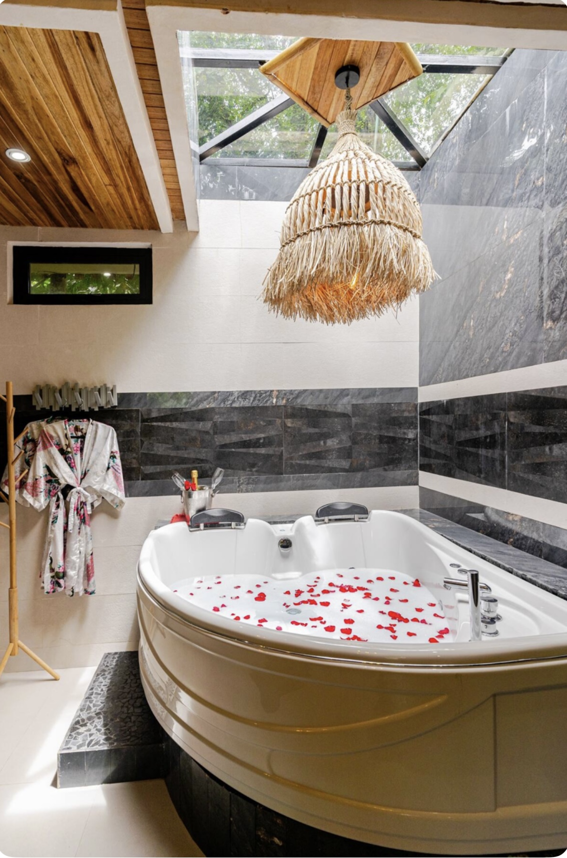 Step into a grand, indoor-outdoor bathroom; a private oasis where luxury meets the elements. Featuring a double Jacuzzi tub and an open-air shower, it is a space dedicated to the ritual of unwinding.
